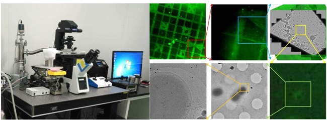 图1 左图:HOPE实物结构示意图;右图:光电关联实验流程示意图:低倍冷冻荧光(10X)图片快速筛选目标所在区域;对荧光信号合适的目标区域进行高倍荧光成像(40X);光电关联匹配图像进一步锁定目标区域;对荧光信号区域内的目标样品进行逐步放大;锁定成像目标;对目标样品进行高分辨率三维数据采集。