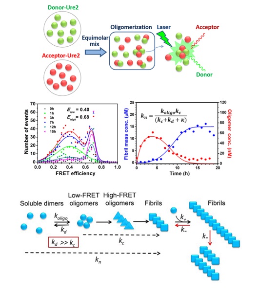 图示:单分子FRET技术观测Ure2淀粉样纤维化过程中的寡聚体及其构象转化,结合全局动力学分析揭示Ure2淀粉样纤维化的多步成核机制。