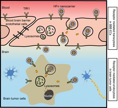 在寻找理想的TfR1配体的研究中,研究人员首次发现,铁蛋白与受体TfR1结合后,会通过脑内皮细胞的转胞吞作用穿过血脑屏障,而不会被阻断在溶酶体之中;而在恶性脑瘤细胞中,在受体TfR1的介导下,铁蛋白会被特异性地富集到溶酶体中降解,进而释放其内部装载的药物。铁蛋白的这种特性,使得其成为理想的能穿越血脑屏障并用于恶性脑瘤治疗的药物载体。在正常小鼠中,研究人员证实铁蛋白可有效穿越完整的血脑屏障;在恶性脑瘤原位移植瘤小鼠模型中,铁蛋白在穿越血脑屏障后,可以特异性地富集到肿瘤区域并抑制恶性脑瘤的生长,而在正常的脑组织无明显的富集。另外,动物安全性实验及病理学分析表明,铁蛋白可特异性地杀伤恶性脑瘤,而对正常脑组织无损伤。研究表明,铁蛋白与TfR1合适的结合亲和力、多结合位点的对称性结构以及理想的纳米尺寸效应是其既可以穿越血脑屏障又对肿瘤组织具有优异的选择性的原因。
