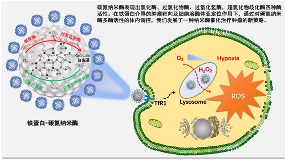 该研究设计发明了具有多重酶活性的新型碳氮纳米酶,并利用铁蛋白的导航,在体内实现纳米酶的精准递送和酶活调控,利用肿瘤特征性的代谢产物,发挥对肿瘤特异而高效的杀伤作用,建立了纳米酶靶向催化治疗肿瘤的新策略,为肿瘤治疗提供了新的思路和技术。
