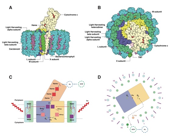 图注:RC-LH的三维结构以及复合体中可能的能量和电子传递示意图。