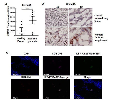 图2. Sema4A及ILT4在哮喘病人的肺组织中特异性高表达