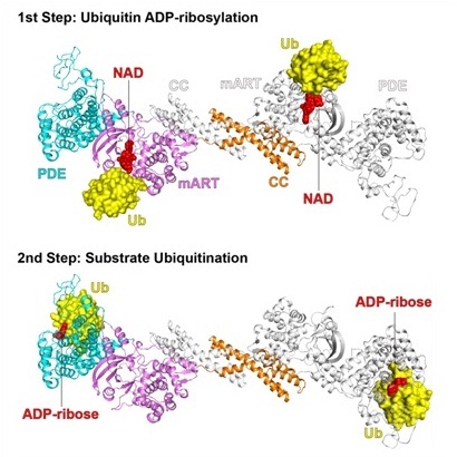 图一:SidE的两步反应中,mART结构域及PDE结构域结合ubiquitin的三维结构