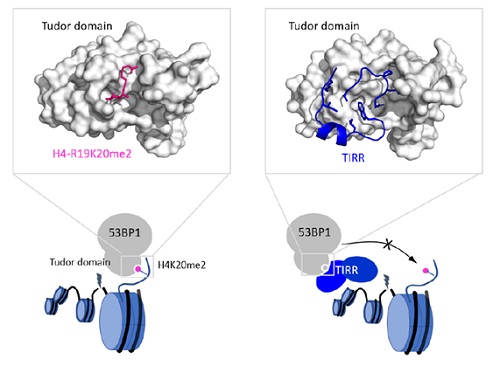 图示:TIRR抑制53BP1 Tudor对H4K20me2识别的分子机制。