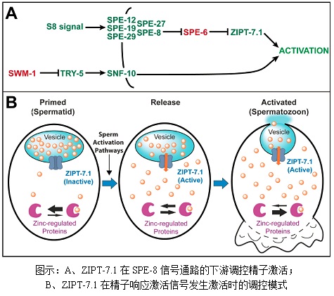 该研究通过正反向遗传筛选,在C. elegans中发现并鉴定了Zn2+转运蛋白ZIPT-7.1,研究了ZIPT-7.1调控精子激活的作用机理。ZIP7蛋白进化过程中在elegans种属出现分离,产生了ZIPT-7.1和ZIPT-7.2两个亚蛋白,他们分别在生殖细胞和体细胞中表达,zipt-7.1基因缺失突变后线虫几乎不育,但线虫个体生长发育正常;而zipt-7.2基因缺失突变后线虫胚胎致死;显示了ZIP7蛋白在个体发育中的重要作用。同时ZIPT-7.1和ZIPT-7.2蛋白在进化过程中的分离为我们研究ZIP7在精子功能中的调控作用提供了条件。该论文系统研究了ZIPT-7.1蛋白在组织及细胞水平上的表达定位,转运Zn2+的特异性;并利用ZIPT-7.1功能缺失突变体,结合C. elegans丰富的遗传资源分析了其在精子激活信号通路中的调控作用,阐述了ZIPT-7.1通过转运Zn2+调节精子激活的分子机理(见下图)。San Francisco State University的Diana S. Chu教授同期进行了“Zinc: A small molecule with a big impact onsperm function”的综述,高度肯定了该研究的重要意义。