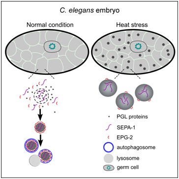 张宏课题组经过长期研究发现PGL颗粒通过液液相分离(liquid-liquid phase separation,LLPS)组装,PGL颗粒的大小以及生物物理性质决定了它们的自噬降解效率。受体蛋白SEPA-1促进PGL-1/-3的相变;支架蛋白EPG-2 控制PGL-1/-3的大小,并且促使它们从液态到水凝胶状态的转化。在高温环境下,mTOR介导的PGL-1/-3磷酸化水平增强,加速了PGL-1/-3的相变,阻止它们被自噬降解。累积的PGL颗粒对于线虫胚胎在热应激条件下的正常发育是必需的。这项工作揭示了在线虫的胚胎发育过程中,mTOR作为一个感受热应激的感受器,通过调节PGL颗粒的相变来控制它们的自噬降解及保护线虫应对热应激的新机制。