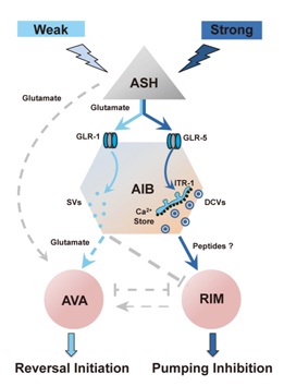 徐涛院士团队联合浙江大学康利军教授团队,利用模式生物秀丽隐杆线虫(C.elegans),发现在不同浓度的奎宁刺激下,中间神经元AIB可以同时调节两种类型的行为:回避响应和进食抑制。低浓度奎宁在AIB中被低阈值、快适应性的谷氨酸受体GLR-1解码,并通过神经递质谷氨酸作用于下游神经元转化为后退回避行为;而高浓度奎宁在AIB中被高阈值、慢适应性的谷氨酸受体GLR-5解码。GLR-5激活后,引起Ca2+从胞内ER钙库中大强度、持续性地释放,触发神经肽分泌,进而激活下游的RIM神经元,从而抑制进食。这项研究揭示了单个神经元通过两种不同性质的谷氨酸受体就可以解码环境化学刺激的强度,进而通过不同的胞内信号编码不同的行为输出,表明了信息传播的功能映射在单神经元水平上的重要性。