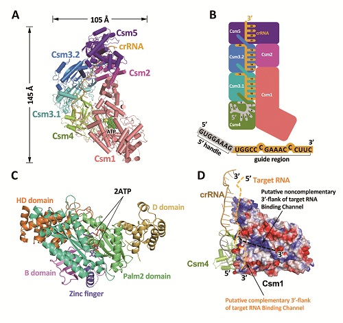 该项研究所报道的III-A型CRISPR-Cas效应复合物结构组成为Csm1121324151:crRNA,复合物整体呈“长靴”状,Csm1位于靴底,Csm1的C端和Csm2各形成一个‘helix bundle’并结合在一起组成靴筒,Csm4、Csm3.1、Csm3.2以及Csm5依次从靴底盘旋而上,和靴筒形成类似于双螺旋的结构。研究人员构建了一条5’端和Csm4结合,并自Csm4起始,贯穿Csm3.1、Csm3.2以及Csm5的crRNA,其中Csm4、Csm3.1及Csm3.2特定的β-sheet依次使得crRNA的8、14和20位碱基发生了翻转,表明了其降解位点,并得到了后续的生化实验验证。