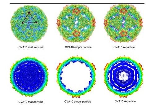 2018年11月26日,《Nature Communications》在线发表了饶子和/王祥喜研究团队的研究论文“Structures of Coxsackievirus A10 unveil the molecular mechanisms of receptor binding and viral uncoating ”。该工作报道了手足口病毒柯萨奇A10(CVA10)三种不同生命周期的全颗粒原子分辨率结构以及脱衣壳中间体的中等分辨率基因组结构,这是该团队继完成对手足口病毒EV71,CVA16不同生命周期的全颗粒结构和功能研究后又一重要研究成果(Wang, X. et.al. Nat StructMolBiol 2012; Ren, J. et al. Nat Commun 2013; Luigi De. et al. Nat StructMolBiol 2014; Ren, J. et al. JVI 2015; Zhu, L. et al. Mbio 2018)。