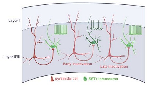 大脑皮层作为调控生物体运动和思维的中枢神经系统,具有复杂的细胞构成和环路连接。在大脑皮层中,约有20%的神经元为GABA能的中间神经元,这些中间神经元根据其形态、生理特性的不同可以分为多种亚类,这些亚类功能各异,相互结合,从而精确地调节着神经网络的复杂活动。其中SST阳性中间神经元出现较早,在快速发放(fast-spiking)类型中间神经元出现之前,对于局部神经网络的建立和发育起到了至关重要的作用,但现今的报道并未对SST中间神经元自身成熟的特征及其早期的发育调控机制给出明确的结论。