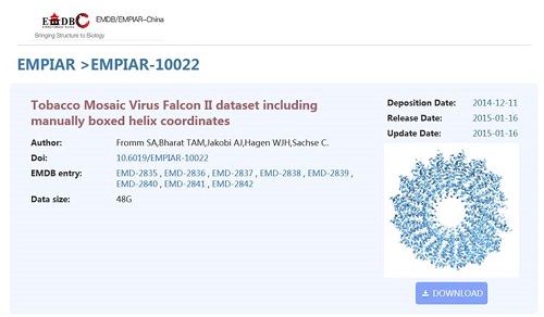 EMDB-China(http://www.emdb-china.org.cn)网站自2018年8月发布以来,已稳定运行5个月,网站点击量累计近万次。为进一步完善EMDB-China网站的数据服务功能、提升用户体验,自2019年1月起EMDB-China网站正式升级为EMDB/EMPIAR-China网站。该网站在对EMDB网站数据作镜像的同时,新增了EMPIAR网站数据的镜像,为方法学研究提供了大量的测试数据集,同时该部分数据集也可以用来做练习。