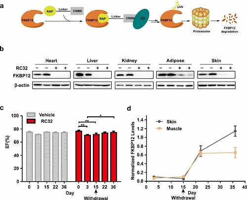 PROTAC(Proteolysis-Targeting Chimera)技术通过招募E3泛素连接酶,利用自身的泛素-蛋白酶体系统实现对靶向特定蛋白降解。FKBP12(FK506 binding protein 12)是在哺乳动物中广泛表达,在很多组织器官中发挥重要的生理功能或调节作用。例如,胚胎期心脏缺失FKBP12时会引起严重的发育性心室缺损,导致胚胎死亡。