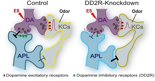 在学习记忆中,多巴胺能(DA)神经元通常代表着奖赏性或惩罚性价值。在果蝇厌恶性学习记忆中,有一簇多巴胺能神经元投射到蘑菇体并且传递电击惩罚信号。本研究发现这簇多巴胺能神经元与上述那对GABA能神经元间存在直接的突触联系,并通过抑制性多巴胺受体DD2R对其进行抑制。通过在体功能性成像与嗅觉学习范式相结合,研究者发现这个抑制作用解除了GABA能神经元对蘑菇体的抑制调节,从而实现了去抑制环路调控。更为重要的是,这个去抑制调节对于学习记忆中发生的突触修饰是必需的,这种修饰引起的神经活性变化可以持续到学习训练之后,代表着一种记忆痕迹的产生。行为学实验显示,这对GABA能神经元中DD2R或其下游分子信号缺失,都会导致学习指数降低。因此,这个研究工作发现了精确控制抑制性GABA能神经元的神经环路机制,并揭示了该调控作用对于记忆形成中突触修饰的关键作用。