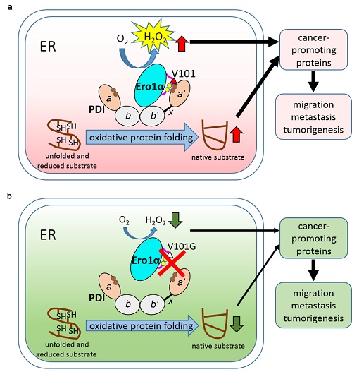 本研究首先通过检测临床样本及组织芯片中Ero1α的蛋白表达,发现Ero1α在宫颈癌中明显上调,其表达量与宫颈癌的恶性程度呈正相关,与病人预后呈负相关。在宫颈癌细胞系HeLa中将ERO1A基因敲除后,癌细胞的生长速度明显减慢、迁移和侵袭能力下降、在小鼠皮下成瘤的能力也明显减弱,这一现象可通过H2O2-相关的上皮间充质转化(EMT)机制实现。随后,通过定点突变、活力测定以及蛋白互作等实验,研究者发现Ero1α与其下游的搭档蛋白PDI相互作用的关键位点为Ero1α的101位缬氨酸残基(Val101),该位点特异地识别PDI的催化结构域。突变该位点之后,Ero1α-PDI相互作用被破坏、两者复合物减少、Ero1α的氧化酶活力下降。表达Ero1αVal101突变体的HeLa细胞也呈现生长减缓、迁移和侵袭能力下降以及小鼠皮下成瘤能力降低的表型。