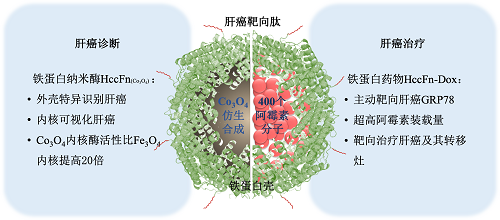 阎锡蕴课题组在前期利用人铁蛋白特异识别肿瘤标记分子TfR1的特性,将纳米酶精准输送到肿瘤部位,并通过酶催化产生活性氧(ROS)杀伤肿瘤的基础上(Nature Communications 2018),又设计出一种能够特异靶向肝癌,使其可视化并杀死肝癌细胞的新型铁蛋白探针,其作用原理如图所示。