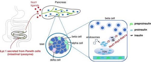 【机制示意图】在肠道菌-溶菌酶-胰岛轴中,肠道潘氏细胞分泌的溶菌酶(Lyz1)切割肠道共生菌细胞壁,产生Nod1配体。Nod1配体可通过血液循环转移至胰岛,激活胰岛beta细胞中Nod1。激活的Nod1与其下游的接头蛋白Rip2定位于胰岛素致密核心囊泡,招募Rab1a,促进分泌囊泡的成熟与转运。