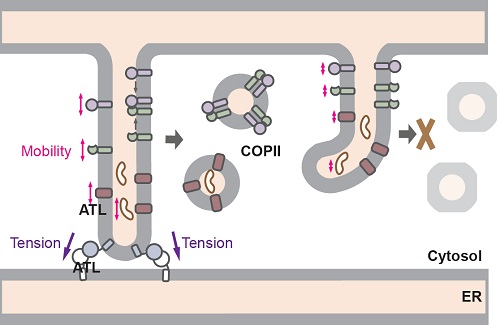 内质网中合成的分泌蛋白和其他内膜系统的膜蛋白在经过折叠修饰后,需要通过COPII (coat protein II) 包被的囊泡运往高尔基体。本研究发现ATL敲除的细胞中,外周COPII的形成显著减少,货物蛋白从内质网的输出被延迟。内质网输出位点(ER exit sites,ERESs)的行成和分布并不受到ATLs缺失的影响,但是很多输出位点不能进一步招募COPII衣被蛋白。半通透细胞的COPII出芽实验显示,内质网中缺失ATLs或内质网被瞬时片段化时,COPII货物蛋白的包装效率都会明显降低,而不同的货物会受到不同程度的影响。进一步研究发现ATL的缺失会降低货物蛋白在内质网中的流动性。有趣的是,不能介导融合但可以部分实现膜拴连的ATL1 R77A突变体在缺失了ATLs的细胞中表达时,虽不能完全恢复内质网的形态,却足以恢复蛋白的流动性和COPII的形成。这些发现表明,内质网膜的拴连对于调控内质网中的物质流动,以及COPII货物蛋白的有效包装起着至关重要的作用。有报道显示,膜的侧向张力对膜的流动性有很大影响,而膜拴连恰恰能起到维持膜侧向张力的效果。