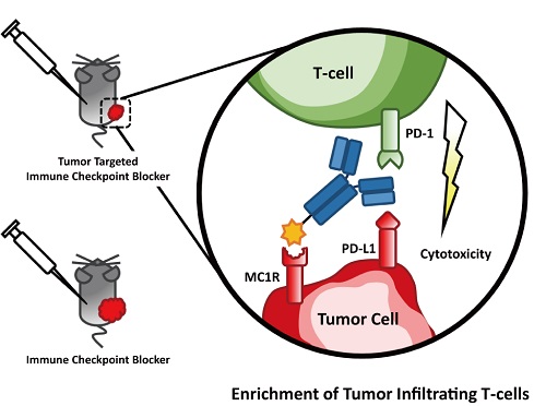在这一研究中,作者将促黑素细胞激素类似物 NDP-MSH通过化学连接的方法,与PD-L1抗体产生共价链接,形成双特异型抗体NDP-MSH-αPD-L1。通过实验分析说明,双特异型抗体NDP-MSH-αPD-L1对于黑色素瘤细胞表面的MC1R受体和PD-L1都有很强的结合活性。在小鼠黑色素瘤模型中,肿瘤靶向的免疫检查点抑制剂双特异型抗体NDP-MSH-αPD-L1在同样剂量下展现出比PD-L1抗体更加显著的肿瘤生长抑制活性。一系列的实验证明,NDP-MSH-αPD-L1的肿瘤生长抑制活性与肿瘤内部的浸润性淋巴细胞的数量呈正相关性,揭示了NDP-MSH-αPD-L1的抑制肿瘤生长的机制:通过在肿瘤微环境中抑制其免疫逃逸机制,增加浸润性淋巴T细胞的数量,增强免疫响应,从而达到抑制肿瘤生长的目的。
