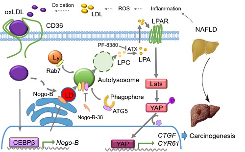 【机制示意图】 Nogo-B促进肝癌细胞代谢重编程的模式图。NAFLD肝炎中的oxLDL摄取入肝细胞促进内质网定位蛋白Nogo-B的表达,促进oxLDL脂滴降解,产生更多的LPA激活YAP,促进了癌基因的表达。
