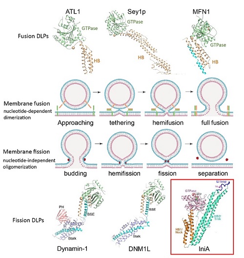 图示: 膜融合与膜分裂的反应模式图。代表性的融合发动蛋白和分裂发动蛋白的晶体结构,其中本研究解析的IniA结构由红框显示。