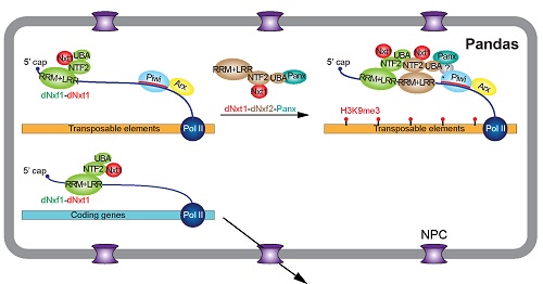 2019年9月30日,中科院生物物理所俞洋团队和上海生化细胞所黄旲团队(现上海交大医学院)在Nature Cell Biology杂志上以长文形式在线发表了题为A Pandas complex adapted for piRNA-guided transcriptional silencing and heterochromatin formation的研究,该工作在俞洋/Hannon之前的工作基础上【4】进一步深入阐明了piRNA介导的转座子异染色质形成的分子机制。该研究发现,生殖细胞特异表达的核转运因子(NXF)家族蛋白dNxf2能与dNxt1(P15)以及Panx形成三元复合物,并通过竞争性结合阻止dNxf1(又叫TAP,是介导mRNA出核的经典接头蛋白)与核孔互作,从而导致了转座子新生RNA在核内的滞留。该文章首次证明PANDAS(Panoramix-dNxf2 dependent TAP/p15 Silencing)复合物的存在,并提出了RNA介导异染色质形成的新理论,既阻断新生RNA出核在调控异染色质过程中起核心作用,并为将来研究其它RNA介导的表观遗传调控提供指导意义(图1)。该文章的发表,也给今年四月份在BioRxiv同时上线的关于Drosophila Nxf2的四篇预印本文章之间的良性竞争画上句号【6-9】。