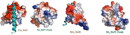 图2. 比较Nxf2型和Nxf1型的UBA结构域。左边,Panx结合面;右边,NPC结合面。