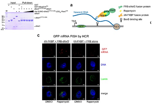 通过大量的文献阅读以及跟研究RNA出核方面的专家(程红)讨论,作者意识到如果仅是dNxf2自身失去核孔复合物结合能力并不足以解释为什么转座子RNA不能出核。dNxf2还需要阻止经典的mRNA出核通路,即通常依赖于mRNA 的5’ Cap结构招募的dNxf1(TAP)复合物。而前人研究也暗示NXF家族蛋白有能力形成异元二聚体,因此,作者大胆假设dNxf2可能通过抑制dNxf1复合物来阻止转座子mRNA的出核。令人兴奋的是,各方面数据包括co-IP,GST pull down,Split luciferase和交联质谱等都充分支持dNxf2:dNxf1能直接互作(图3)。