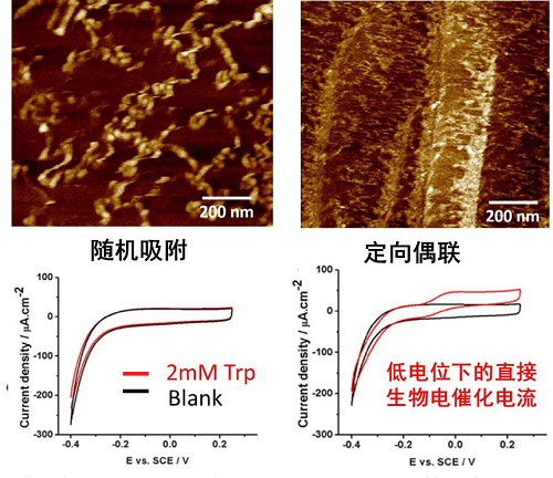 改进酶电化学生物传感器(EEB)的重点之一是改善酶和电极之间的电子传递。在EEB中使用电子介体是一种改善电子传递的常用方法,但使用电子介体通常会导致相对于酶的原始氧化还原电位增加的过量电位,并且氧化还原介质通常是非选择性的,不仅促进了电极和蛋白质之间的电子转移,也促进了各种干扰分子的电子转移。此外,电子介体在活体分析领域的应用也存在诸多限制。利用纳米材料增强酶电极的电子转移为第3代生物传感器的实现做出了巨大贡献,但酶相对于电极表面的随机取向导致电子转移效率的较大变化。本研究通过基于基因密码子扩展的非天然氨基酸插入技术,位点特异性的将巯基苯丙氨酸(TF)插入到酶特定位点中,TF的巯基通过我们发展的新型生物正交“S-Click”反应与连接分子(Bodipy373)的氯苯基团特异偶联,而连接分子通过π-π stacking组装到碳材料表面,实现不同氨基酸氧化酶在碳材料电极表面的定点偶联(如图2所示)。本团队开创的定点偶联体系(S-Click, 图2C),相比于目前主流的基于叠氮基-炔烃基“点击化学”的偶联体系,具有更好的反应活性与生物相容性,更符合开发可穿戴设备的需求。基于该技术制备的色氨酸氧化酶电极展现出了更高更均匀的酶负载,同时在电化学测试中也展现出了极低催化电位的色氨酸直接生物电催化。(图3)