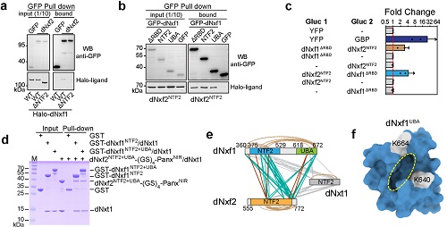 图3. 四方面证据证实dNxf2NTF2跟dNxf1 NTF2+UBA直接互作。