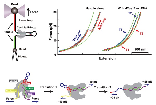 在本项研究中,娄继忠课题组利用自主搭建的高分辨光镊仪器,并结合生物化学、单分子荧光等手段对氨基酸球菌属Cas12a (Acidaminococcus sp. Cas12a, AsCas12a) 蛋白R-loop复合体的形成及结构稳定性进行了较为系统的研究。研究发现,当crRNA和靶DNA的碱基配对长度达到18bp时,R-loop结构达到一种稳定的检查点状态,此时Cas12a采取一种活性构象为随后靶DNA的切割做准备。一旦稳定的R-loop结构形成,Cas12a会率先对非目标链进行切割,由于非目标连与Cas12a的结合相对松散,因此它会很容易地从Cas12a酶切中心释放出来,随后闲置的RuvC活性中心又会和目标链结合并进行切割。由于受到Cas12a保护的RNA-DNA杂合双链的长度被限制在20bp,20bp外的DNA目标链呈现为单链形式,因此很容易与Cas12a的酶切中心结合。在这一过程中,Cas12a的Nuc结构域通过与非目标DNA的结合,抑制靶DNA双链的再退火从而稳定形成的R-loop结构。