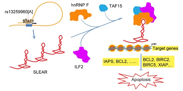 安徽医科大学张学军教授团队2009年发表了国内首个SLE全基因组关联分析工作,我们从GWAS数据中系统发现了一个位于长非编码基因内含子区的SNP位点rs13259960与SLE显著相关,并将此长非编码基因命名为SLEAR。SLEAR在SLE患者PBMC中的表达水平显著低于正常对照人群,而且在rs13259960位点发生突变的SLE患者中的表达水平更低。通过实验,我们发现rs13259960位于SLEAR的一个增强子中,该位点的突变会削弱STAT1与该增强子的结合,从而影响SLEAR的表达水平。SLEAR能够与ILF2、hnRNPF和TAF15结合形成一个RNA和蛋白的复合物来调控抑制细胞凋亡基因的表达。体外实验表明SLEAR能够调控细胞的凋亡,并且在SLE病人体内SLEAR的表达水平也与凋亡显著相关。SNP位点的突变导致SLEAR水平的降低,进一步引起细胞凋亡的增加。