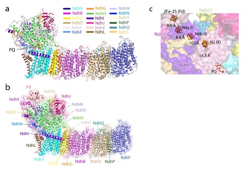 图示. NDH-PQ(a)和NDH-Fd(b)复合物三维结构及电子传递链辅因子(c)