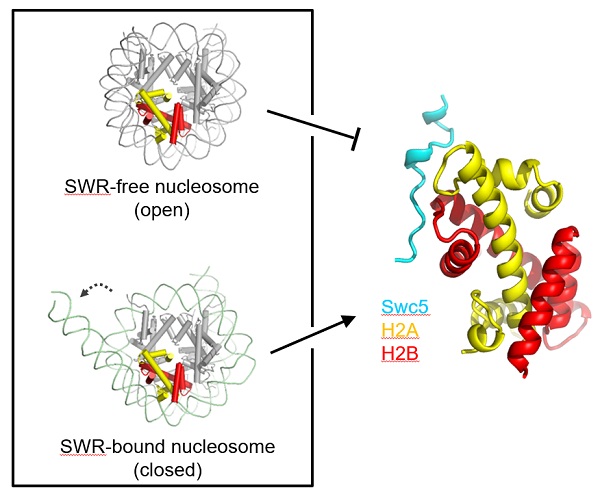 图一,Swc5结合核小体中的H2A-H2B并促进后者从核小体上移除