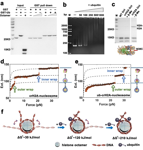 H2A作为最早发现被泛素化修饰的组蛋白,在高等真核生物中,约有5-15%的H2A在高度保守的K119位被单泛素化修饰(ubH2A)。研究发现ubH2A大量富集在不活跃的近着丝粒区、失活的X染色体和沉默的发育基因区域。ubH2A的建立主要依赖多梳复合物(PRC)中的RING1B(E3),敲除RING1B能显著降低特点基因启动子附近的ubH2A水平,并导致ubH2A总体水平的显著下降。但是对于ubH2A建立起来后如何调控核小体仍然并不清楚。2020年2月5日,金沙集团1862cc生物物理所李国红、生物物理所客座研究员/首都医科大学陈萍与物理所李伟合作团队在JACS上在线发表了题为“Histone H2A Ubiquitination Reinforces Mechanical Stability and Asymmetry at theSingle-Nucleosome Level”文章,从单分子水平上探讨ubH2A对核小体结构调控的分子机制。