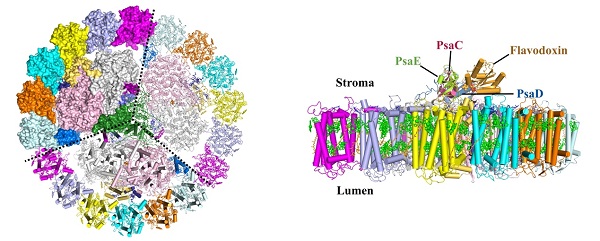 左图:从胞质侧观察PSI-IsiA超复合物的整体结构(为清楚起见去掉了胞质侧的外周亚基),虚线分开PSI三体的每个单体。右图:从膜平面方向观察PSI-IsiA-Fld超复合物的整体结构,只展示了一个PSI核心及6个IsiA蛋白,PSI核心外周亚基及Fld蛋白在图中标出。