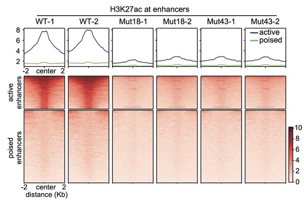 进一步的研究发现,基因组中H3K9、H3K18、H3K122、H4K5以及H4K8的乙酰化分布均没有明显变化。乙酰化修饰能够中和赖氨酸正电性,削弱组蛋白与DNA结合的能力。因此,该研究说明了增强子的活性并不依赖于单一特定位点的乙酰化修饰,而是需要多个位点乙酰化修饰协同作用,使染色质结构变得松散,从而维持增强子的活跃状态。