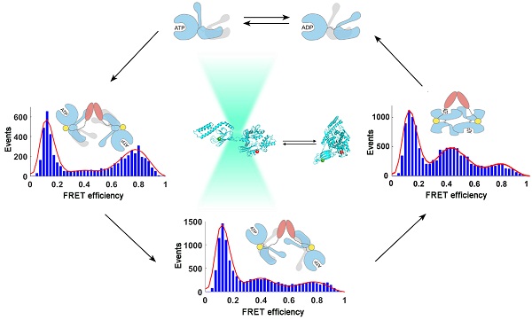 本研究采用单分子FRET技术揭示了不同核苷酸结合态下,人源应激型Hsp70(hHsp70)的核苷酸结合域与底物结合域之间均具有构象多态性,同时发现辅分子伴侣Hsp40(Hdj1)可提高hHsp70在ATP结合态下发生结构域分离的构象比例,并诱导hHsp70分子间二聚化,从而激活hHsp70的ATP水解酶活性。通过进一步动力学研究,获得了Hdj1与hHsp70结合、引发hHsp70发生分子内变构、以及引发hHsp70二聚化组装的速率,提出了Hsp70-Hsp40参与ATP水解循环的多步动力学机制。该研究揭示了Hsp70分子动态性对其发挥功能具有重要作用,为进一步阐明序列和结构高度同源的不同种类Hsp70之间的差异及其与功能的关系提供了新的线索。