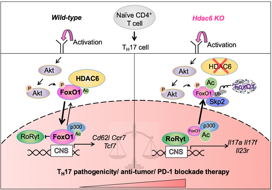 研究人员通过小鼠荷瘤实验发现,敲除肝癌细胞系中HDAC6基因不影响肝癌体内成瘤,但HDAC6敲除小鼠显著抑制肝癌皮下成瘤,这提示HDAC6主要通过免疫微环境来影响肝癌的进程。进一步实验证实,HDAC6敲除能够特异的诱导TH17细胞的分化及功能,并促进过继转移CD8+ T细胞的效应功能和肝癌清除能力。由于肝癌微环境能够形成强大的免疫耐受系统使得免疫检查点疗效受到极大的阻碍,研究人员发现靶向抑制HDAC6的TH17细胞能够很好的促进T细胞在肝癌中的浸润,并促进肝癌组织对anti-PD1抗体治疗的反应性。在分子机制上,胞浆定位的HDAC6直接对转录因子FoxO1赖氨酸K242位点进行去乙酰化修饰来维持FoxO1的入核及蛋白的稳定性。核转位的FoxO1能够直接功能上抑制TH17细胞转录因子RoRγt的活性,从而抑制TH17细胞的分化及效应功能。并且研究人员通过人源的TH17细胞证实了HDAC6-FoxO1信号调控机制在进化上是保守的。这些结果证明,在肝癌进程中HDAC6是连接免疫微环境和肝癌发生的重要调控因子,为肝癌肿瘤微环境的研究提供了新思路。