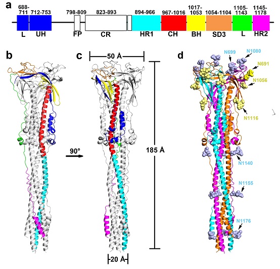 Figure 1. SARS-CoV S糖蛋白的融膜后结构及糖基化位点分布。