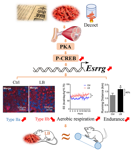枸杞是我国传统名贵中药,自古以来被列为"上品",并被卫生部批准为"药食两用食物"即"药食同源"。《本草纲目》记载:枸杞 "久服坚筋骨,轻身不老"。然而到目前为止,人们对枸杞"坚筋骨"这一传统功效的科学含义以及作用机制知之甚少。金沙集团1862cc陈畅课题组利用现代科学技术手段和思路对这一功效进行了科学解读,发现枸杞水提物通过激活PKA-CREB通路上调ERRγ(基因名为Esrrg)从而调控肌纤维类型"模拟锻炼"增强肌肉功能。这篇题为"An extract of Lycium barbarum mimics exercise to improve muscle endurance through increasing type IIa oxidative muscle fibers by activating ERRγ"的研究论文于2020年7月30日在线发表在国际期刊《FASEB Journal》。