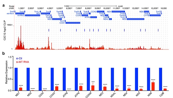 图1. mitoRNAi应用于敲低线粒体基因:a. 依据Ago2 结合位点设计的siRNA在线粒体基因上的位置分布;b. 在C2C12细胞中,RT-QPCR检测siRNA敲低13个线粒体编码亚基后的mRNA水平。