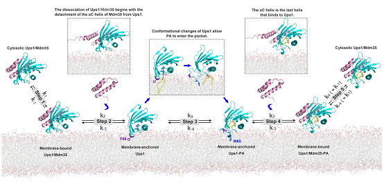 心磷脂(CL)作为线粒体内膜特异性磷脂,在维持线粒体正常形态和功能上发挥着重要的作用。CL以PA为底物在线粒体内膜的基质侧合成。PA在内质网上合成并由内质网线粒体接触复合物(ERMES)转运至线粒体外膜。2010年德国Thomas Langer组报道线粒体膜间隙Ups1/Mdm35及其哺乳动物同源复合物PRELID1/TRIAP1具有在转运PA的功能。此后,一系列关于起转运PA的分子机理的研究结果相应而出。尽管如此,已有报道只研究了Ups1/Mdm35复合体的Apo状态和底物结合两种状态,对其具体转运磷脂酸过程一些中间状态仍然不清楚,例Ups1/Mdm35如何结合到膜上?PA是如何进入Ups1磷脂结合口袋的?Ups1-PA 复合体如何从膜上解离下来等。本研究通过晶体学研究解析了Ups1/Mdm35复合体的三种结构,其中包括domain swap形式、单体apo形式和底物磷脂酸DHPA(1,2-dioleoyl-sn-glycero-3-phosphate)结合态。与以往研究不同,底物结合态呈现出一种Mdm35与Ups1弱相互作用的状态。研究人员通过一系列生物物理实验,证实了改变Mdm35的 α3螺旋与Ups1的相互作用会影响Ups1与膜的相互作用,继而影响其PA转运活性。全原子动力学模拟和突变实验发现Ups1通过 α2 loop、α3螺旋和L2 loop与膜相互作用,而 α2 loop 上的F69和W65残基在Ups1结合PA前后交替插入到膜中,锚定Ups1分子。研究人员首次提出了Ups1/Mdm35转运PA的分子动力学方程,并推导出Ups1/Mdm35与膜结合的化学平衡常数表达式。最后,综合理论推导和实验研究,提出了Ups1/Mdm35复合体转运PA的详细分子模型(图1),深化了人们对于脂转运蛋白工作机制的认识。