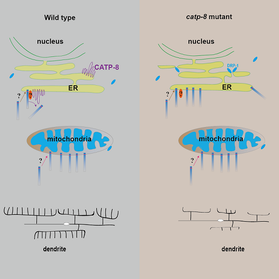 研究人员以线粒体SA/TA蛋白为研究对象,在线虫中进行大规模筛选,发现catp-8突变体导致线粒体SA/TA蛋白错误定位至ER,而线粒体表面的两次跨膜蛋白不会被影响。荧光定位实验发现CATP-8特异定位在ER上,暗示其在ER上发挥功能。有意思是,通过光转换和热激诱导表达实验,研究人员发现CATP-8可以将已经错误定位到ER上的线粒体蛋白移除,并且该过程不依赖于ERAD通路。为了研究CATP-8移除ER错误定位蛋白对维持ER特异"身份"的重要性,研究人员发现线粒体外膜蛋白FIS-1和MFF-2在catp-8突变体中错误定位至ER,导致线粒体分裂因子DRP-1被错误招募到ER上,从而引起ER断裂。同时,研究人员还发现CATP-8通过调控树突受体蛋白DMA-1水平影响线虫PVD神经元树突形态发育。这暗示出CATP-8不仅通过移除错误定位到ER的线粒体蛋白以维持正确的ER形态,同时也对维持ER正常生理功能很重要。该研究报道了ER蛋白P5A ATPase/CATP-8行使监察机制将错误定位在ER上的蛋白移除,以及其对维持ER正确的形态和功能的重要性。