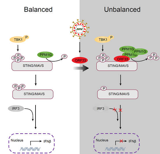 综上所述,该工作首次发现蛋白磷酸酶PPM1G是负调节抗病毒天然免疫反应的宿主因子;此外,该工作揭示了疱疹病毒免疫逃逸的一种新策略,即间质蛋白ORF33招募宿主蛋白磷酸酶PPM1G 对STING和MAVS进行去磷酸化,从而抑制IFNβ的产生及宿主的抗病毒反应,有利于病毒的复制。