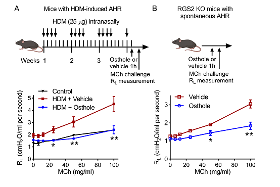 图1 蛇床子素抑制屋尘螨提取物诱导小鼠哮喘疾病模型(A)及RGS2敲除所致小鼠哮喘疾病模型(B)的气道高反应性。