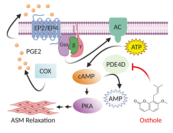 气道高反应性是指气道对多种刺激因子出现过强或过早的收缩反应,这一症状在哮喘病人中尤为常见,严重时可导致病人呼吸困难。常规使用的肾上腺素受体激动剂虽可有效抑制气道高反应性,但容易产生耐药反应。联合研究团队发现蛇床子素可舒张平滑肌细胞,并有效抑制气道高反应性;在肾上腺素受体脱敏的模型中,蛇床子素亦可保持高效舒张潜能。