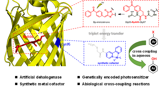 2021年1月7日,JACS期刊发表了王江云课题组与华中科技大学钟芳锐、吴钰周教授课题组题为"Biocatalytic Cross-Coupling of Aryl Halides with a Genetically Engineered Photosensitizer Artificial Dehalogenase" 的研究文章。文中报道了基于该课题组前期设计的一种可以基因编码的光敏蛋白质,进一步实现了光敏蛋白质吸收光能驱动卤代芳烃羟化脱卤反应的功能。
