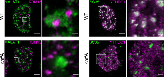 图1 . 野生型和MALAT1-Δm6A细胞中RBM15斑点与核斑互作,以及YHDC1在核斑中富集程度的对比。