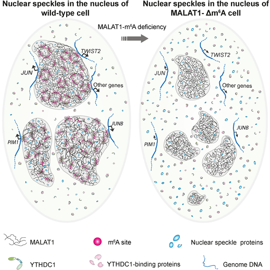 图2. MALAT1通过其m6A修饰调控基因表达示意图。