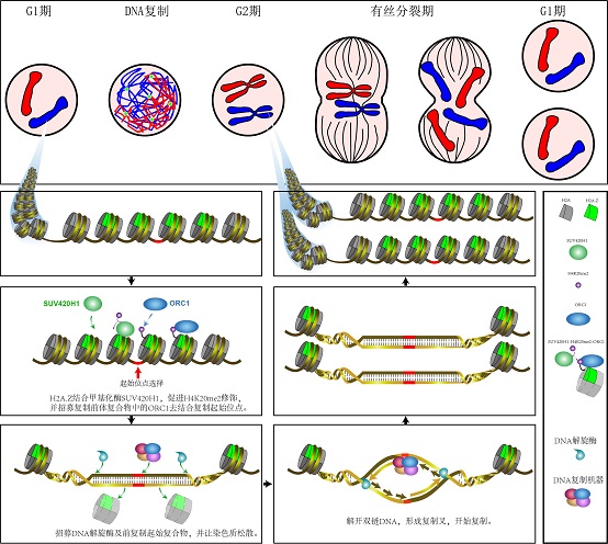 DNA复制是人类遗传物质在细胞之间得以精确传递的基础。在细胞增殖过程中,通过DNA复制,一套亲本遗传物质将产生两套完全一样的子代遗传物质分配到两个子代细胞中。不准确或不完整的DNA复制将会导致子代细胞中的遗传物质突变,并可能诱发癌症。在DNA复制时,首先需要在基因组上识别开始复制的地方--也就是DNA复制起始位点。DNA复制起始位点的识别条件除了有特定的DNA序列,还要有特异的染色质环境,即表观遗传特征。这些特点使得DNA复制起始位点能够在细胞需要进行增殖时及时、高效地开始DNA复制,保证遗传物质的完整性。但目前,人们对高等生物中识别DNA复制起始位点的具体过程并不清楚,这在一定程度上也阻碍了人们对癌症发生发展机制的理解。在2020年,金沙集团1862cc李国红课题组和朱明昭课题组合作,在《自然》杂志发表了相关论文,揭示了一种精细的DNA复制起始位点的识别调控机制。该研究发现,组蛋白变体H2A.Z能够通过结合组蛋白甲基化转移酶SUV420H1,促进组蛋白H4的第二十位氨基酸发生二甲基化修饰。而带有二甲基化修饰的H2A.Z核小体能进一步招募复制起始位点识别蛋白,从而帮助DNA复制起始位点的识别(图1)。该研究进一步发现,被H2A.Z-SUV420H1-H4K20me2通路调控的复制起始位点具有很强的复制活性,并偏向在复制期早期被激活使用。在癌细胞中破坏该调控机制后,癌细胞的DNA复制和细胞生长都受到了抑制。在T细胞中破坏该调控机制后,T细胞的免疫激活也受到了抑制。综上所述,该研究阐述了一个新颖的由H2A.Z介导的DNA复制表观遗传调控机制,对理解高等生物DNA复制起始位点的识别提供了新的视角。而深入理解DNA复制的调控机制对于理解生长发育和免疫细胞激活等许多生理过程都有重要的意义,同时也为理解癌症发生和癌症治疗提供理论基础。
